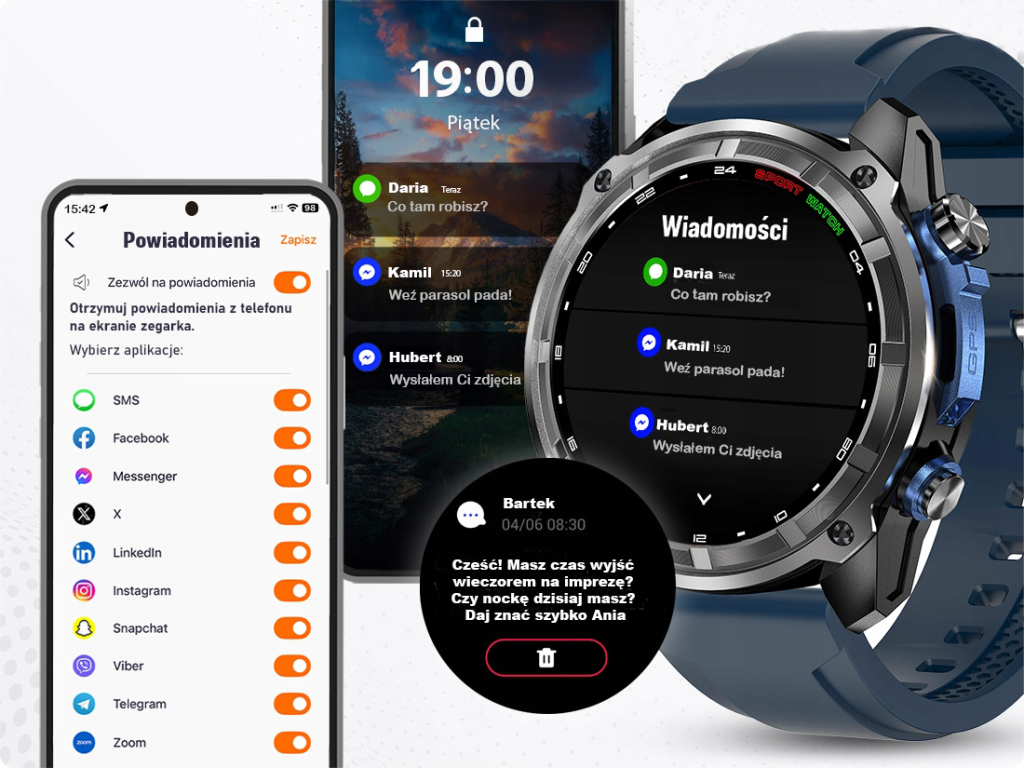 Odbieraj i wykonuj połączenia bez wyciągania telefonu. Otrzymuj wiadomości SMS, powiadomienia z aplikacji i komunikatorów od razu na zegarku.