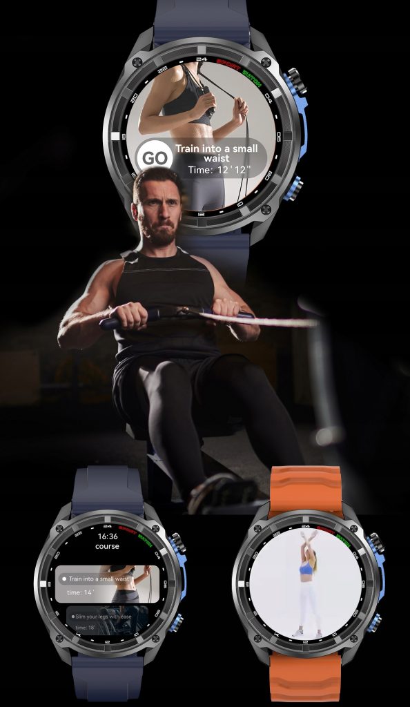 Na ekranie zegarka wyświetlane są animowane instrukcje ćwiczeń oraz gotowe kursy treningowe, które krok po kroku poprowadzą Cię przez cały zestaw ruchów – bez potrzeby korzystania z telefonu czy komputera.