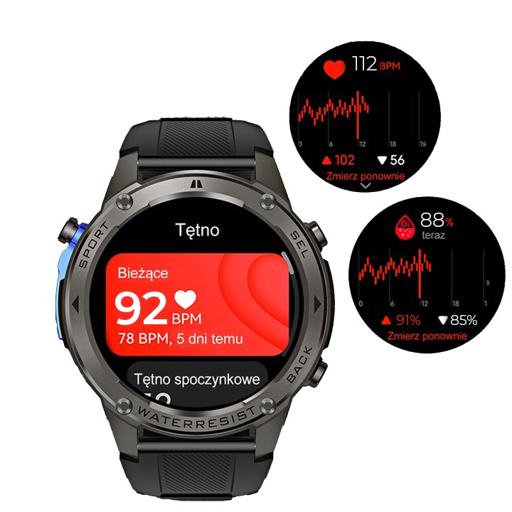• Saturacja krwi (SpO2) – Stały pomiar natlenienia.